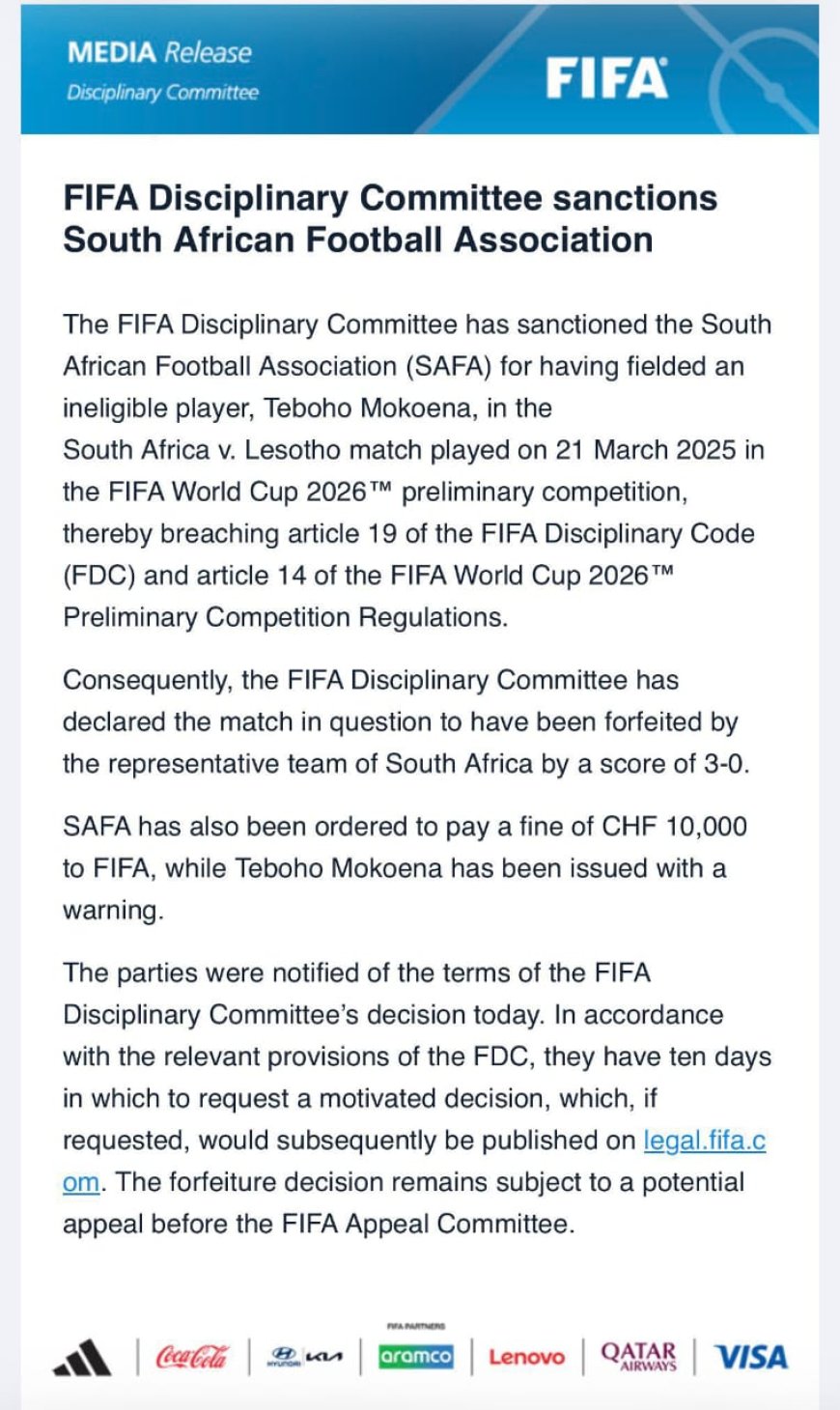 FIFA has penalized South Africa for fielding an ineligible player in their match against Lesotho.