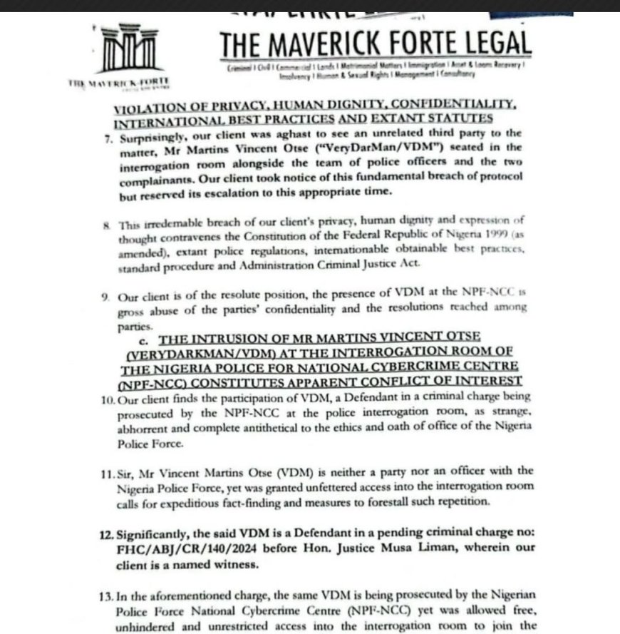 In the petition, Ojo raised serious concerns over the conduct of controversial social media personality VeryDarkMan (VDM), who she alleges was allowed unauthorized access to her interrogation room during an ongoing police investigation. According to her, VDM who is himself facing criminal charges in a separate case entered the interrogation room uninvited and unannounced while she was being questioned, a move she described as an “intimidating and unlawful intrusion