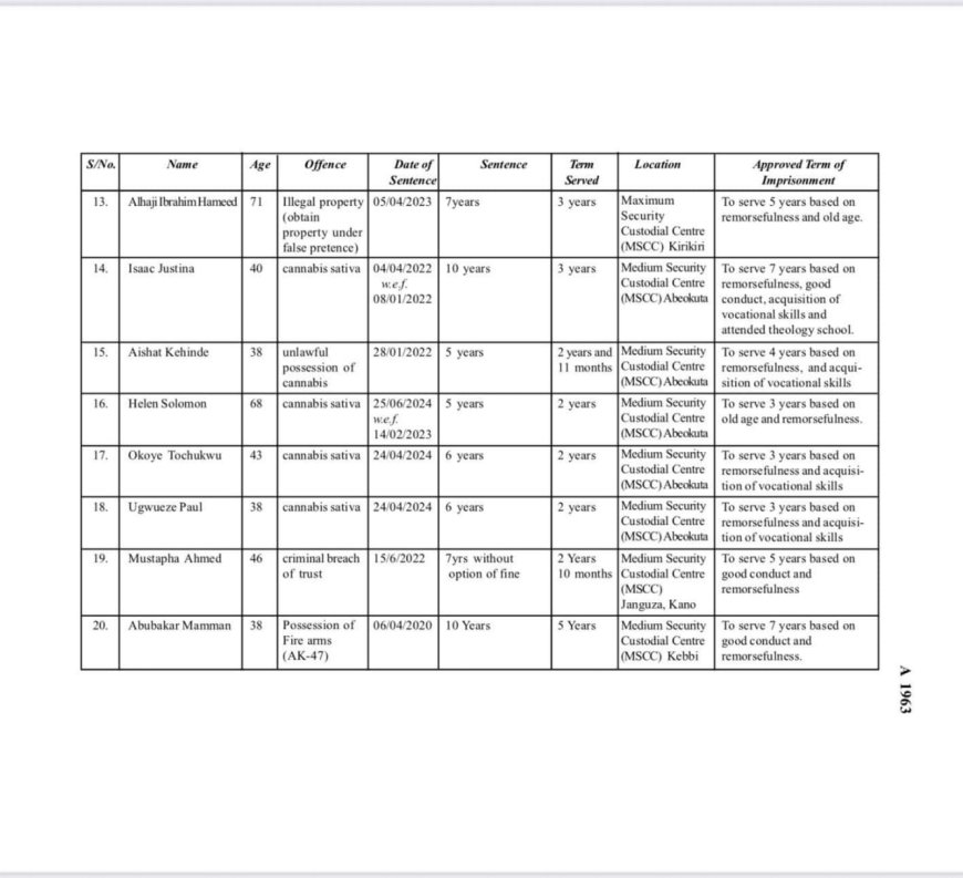 Others include Chief Emeka Agbodike, convicted of obtaining property by false pretence in 2023, whose seven-year sentence was reduced to three years, and Isaac Justina, jailed for cannabis possession in 2022, whose term was reduced from ten to four years.