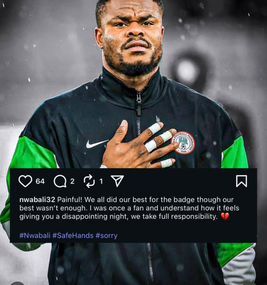goalkeeper Stanley Nwabali has issued an apology to Nigerian fans following the team’s disappointing defeat to DR Congo in Morocco.