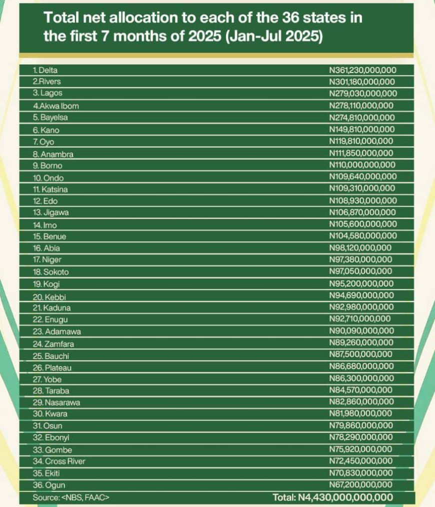 Leading the list of top beneficiaries is Delta State, which received about ₦361.23 billion. It is followed by Rivers State with ₦301.18 billion, Lagos State with ₦279.03 billion, Akwa Ibom with ₦278.11 billion, and Bayelsa State with ₦274.81 billion. These states, largely oil-producing, continue to receive the highest allocations due to their revenue contributions to the federation account.