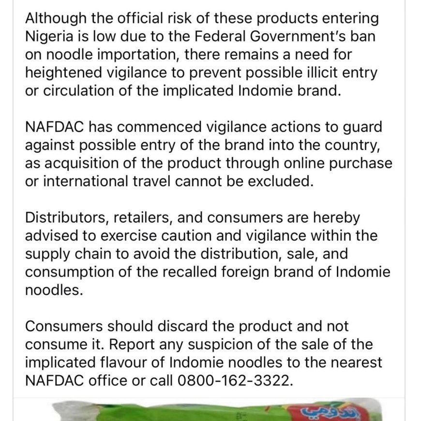 The National Agency for Food and Drug Administration and Control (NAFDAC) has ordered a recall of Indomie brand noodles, specifically the Vegetable Flavour product.