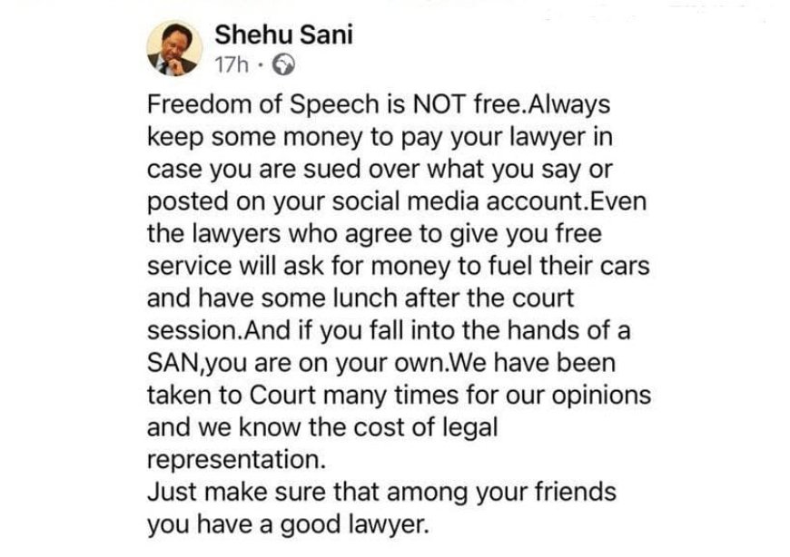 Senator Shehu Sani has reminded Nigerians that freedom of speech often comes at a financial cost.